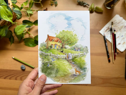 Cottage with Cats on a Sunny Hill Watercolor Illustration Art Print