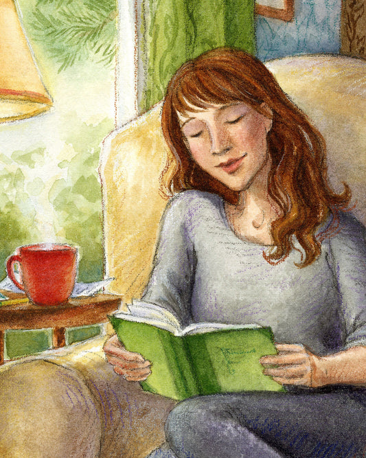 Book Girl Art Print - Reading Story Illustration, Literature, Library Art, Book Collector, Coffee, Tea, Cozy
