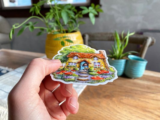 Jolly Little Cottage 3" Vinyl Sticker, Cottagecore Watercolor Fairy Dollhouse Garden