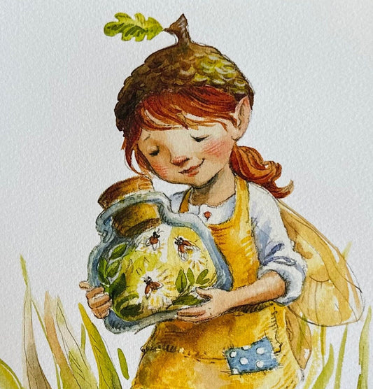 Lantern Fairy - Art Print Firefly Watercolor Cottagecore Whimsical Illustration Acorns Oak