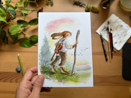 Mandolin-Playing Wandering Rabbit Watercolor Illustration Print