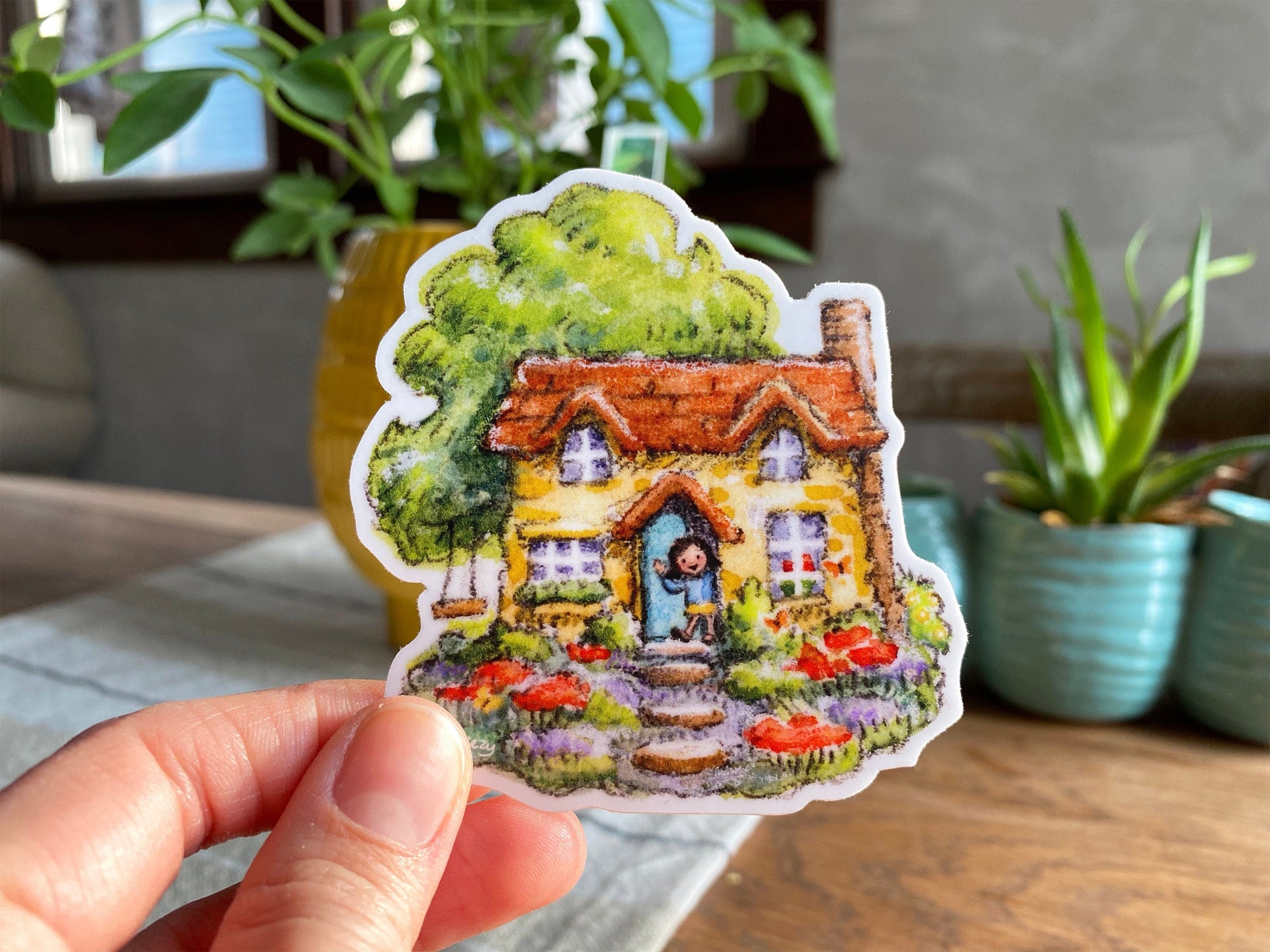 Jolly Little Cottage 3" Vinyl Sticker, Cottagecore Watercolor Fairy Dollhouse Garden